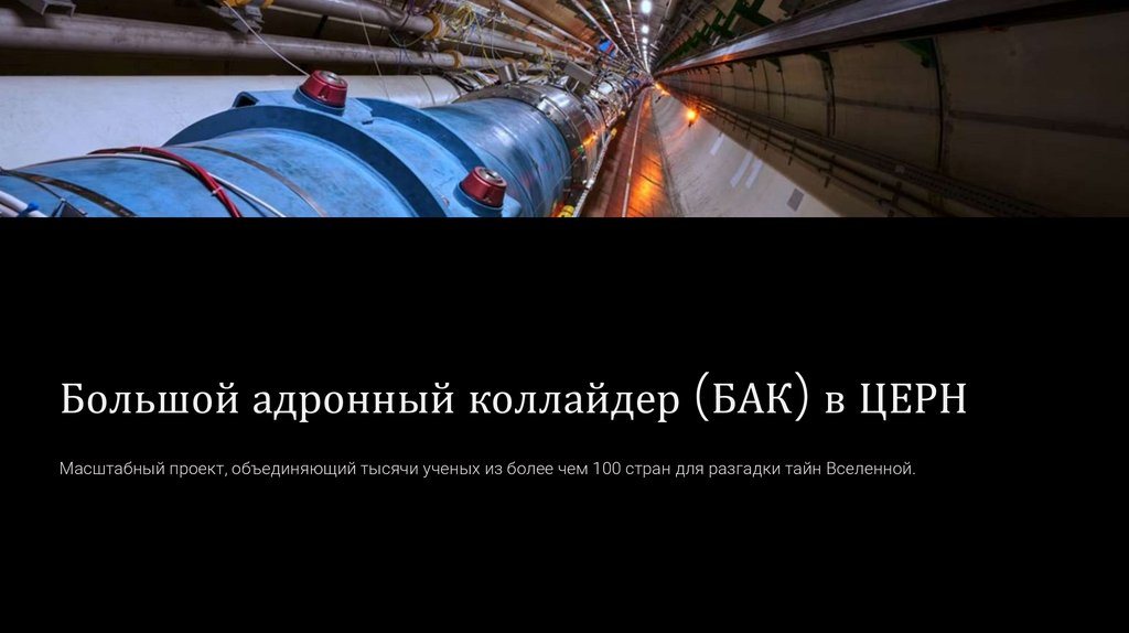 Большой адронный коллайдер (БАК) в ЦЕРНМасштабный проект, объединяющий тысячи ученых из более чем 100 стран для разгадки тайн Вселенной.