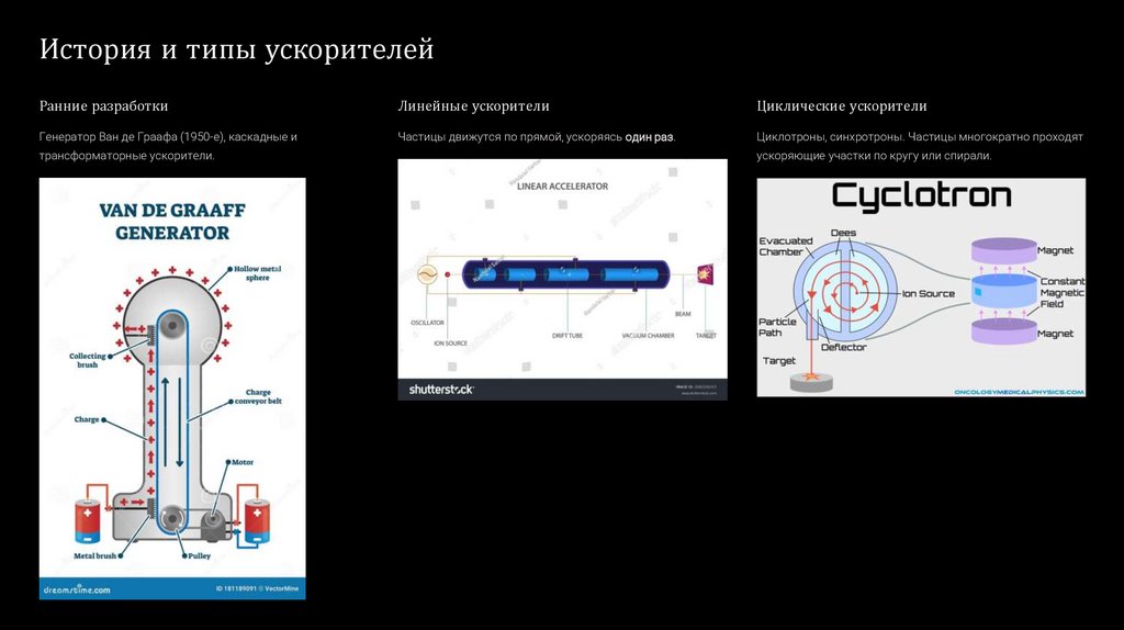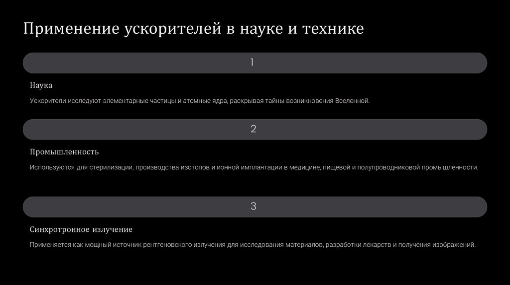 Используются для стерилизации, производства изотопов и ионной имплантации в медицине, пищевой и полупроводниковой промышленности.