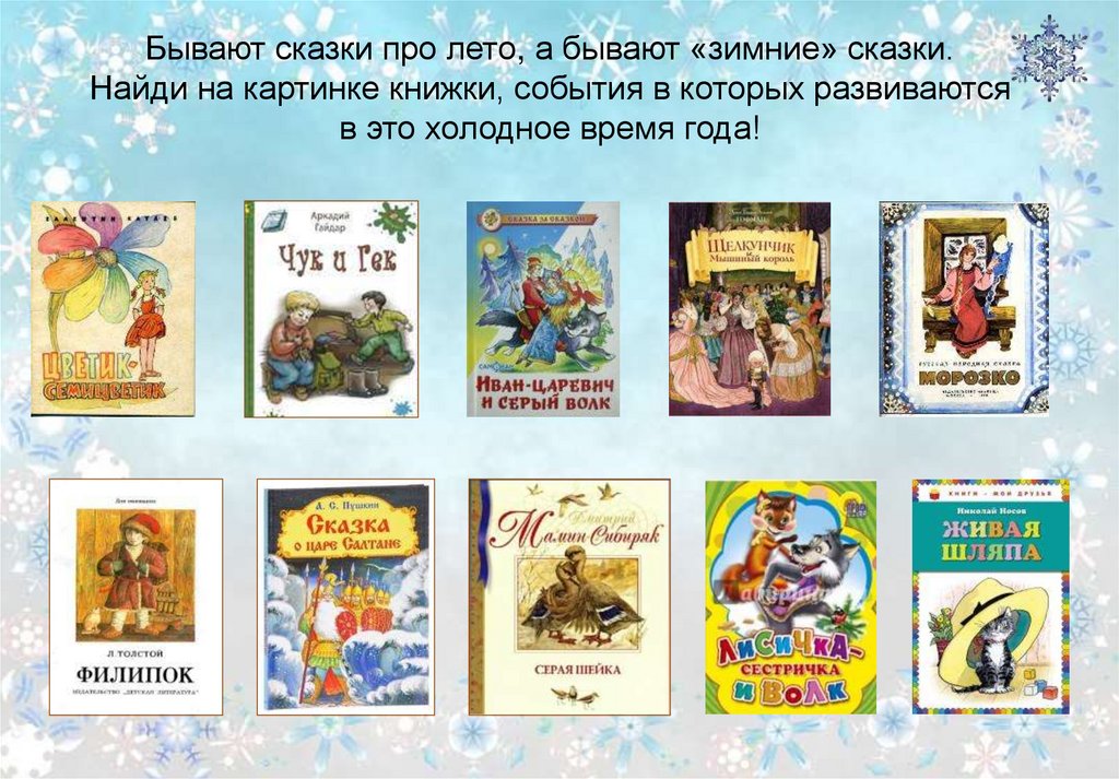 Бывают сказки про лето, а бывают «зимние» сказки.Найди на картинке книжки, события в которых развиваются
