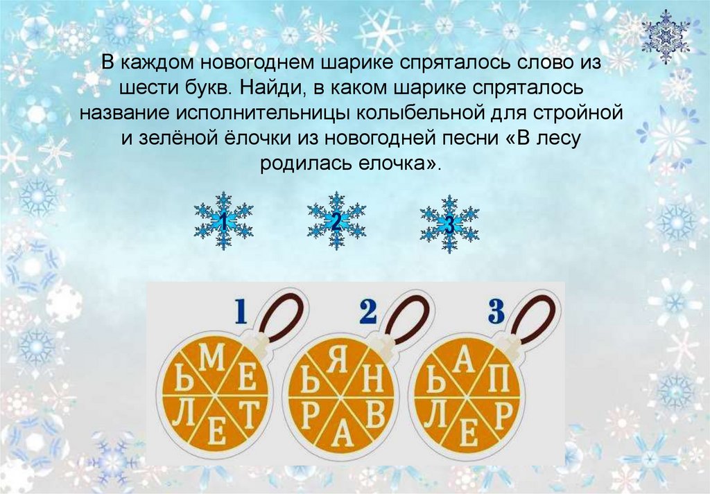 В каждом новогоднем шарике спряталось слово изшести букв. Найди, в каком шарике спряталось