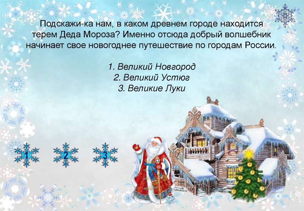 Подскажи-ка нам, в каком древнем городе находитсятерем Деда Мороза? Именно отсюда добрый волшебник