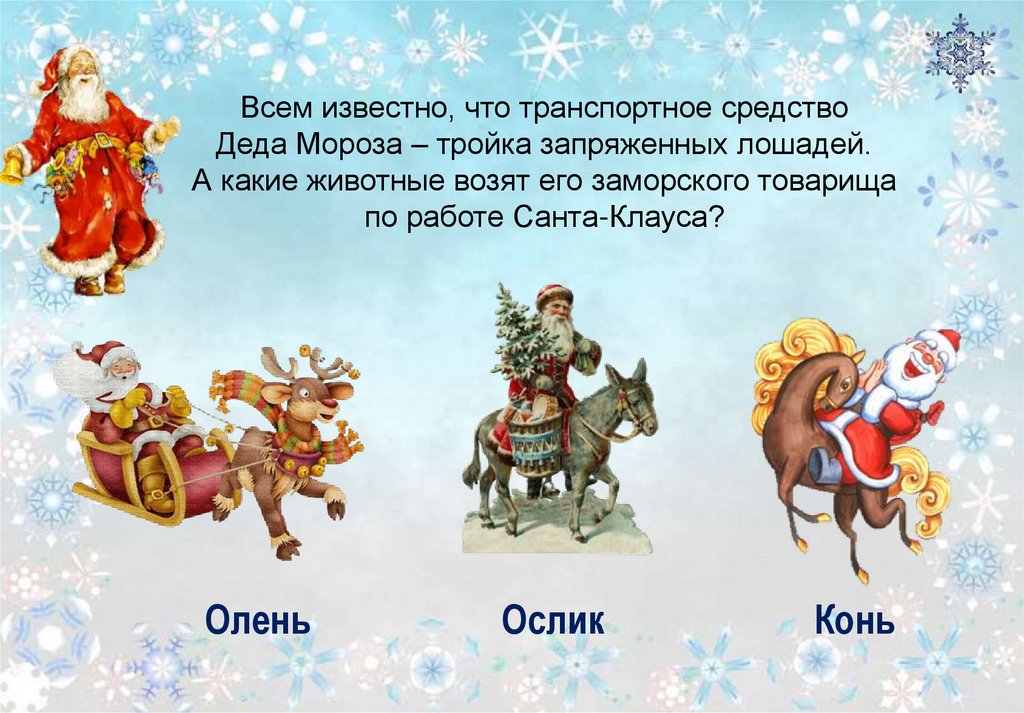 Всем известно, что транспортное средствоДеда Мороза – тройка запряженных лошадей.