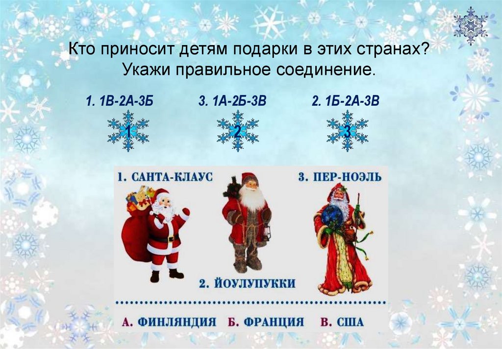Кто приносит детям подарки в этих странах?Укажи правильное соединение.