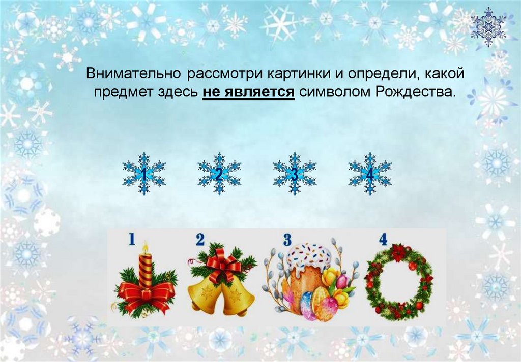Внимательно рассмотри картинки и определи, какойпредмет здесь не является символом Рождества.