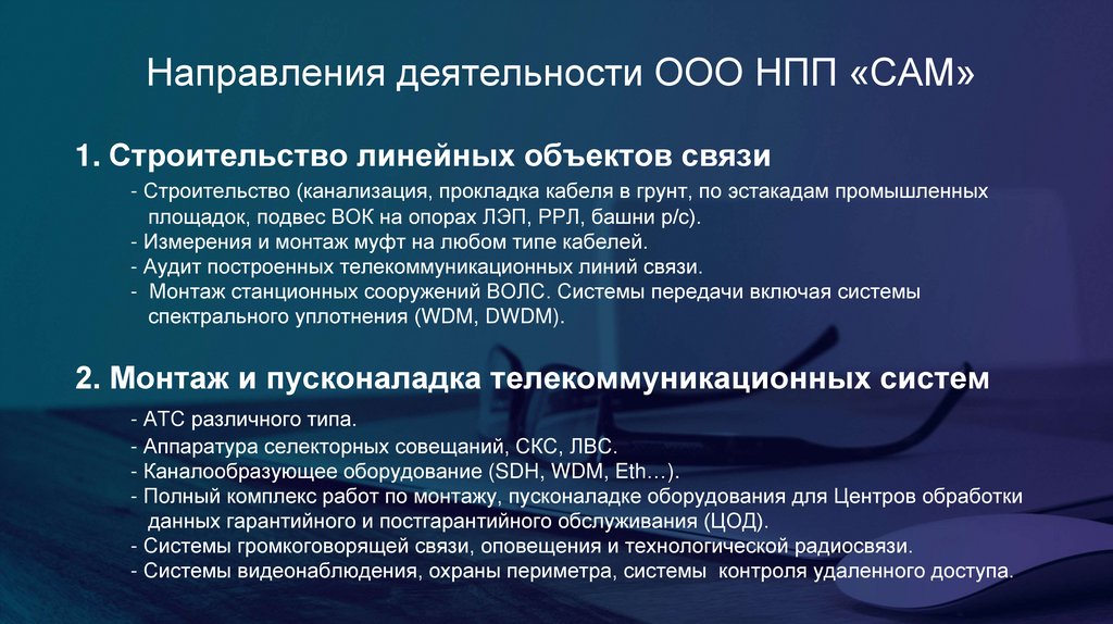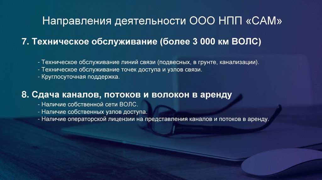 Направления деятельности ООО НПП «САМ»7. Техническое обслуживание (более 3 000 км ВОЛС)