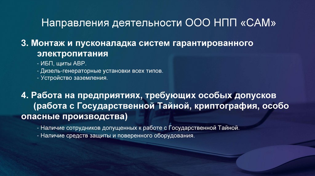 Направления деятельности ООО НПП «САМ»3. Монтаж и пусконаладка систем гарантированного