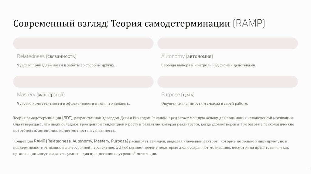 Концепция RAMP (Relatedness, Autonomy, Mastery, Purpose) расширяет эти идеи, выделяя ключевые факторы, которые не только инициируют, но и