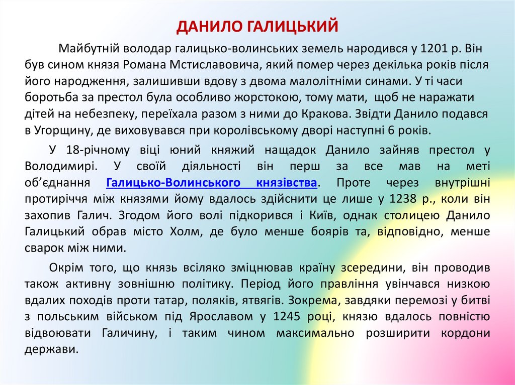 ДАНИЛО ГАЛИЦЬКИЙМайбутній володар галицько-волинських земель народився у 1201 р. Він