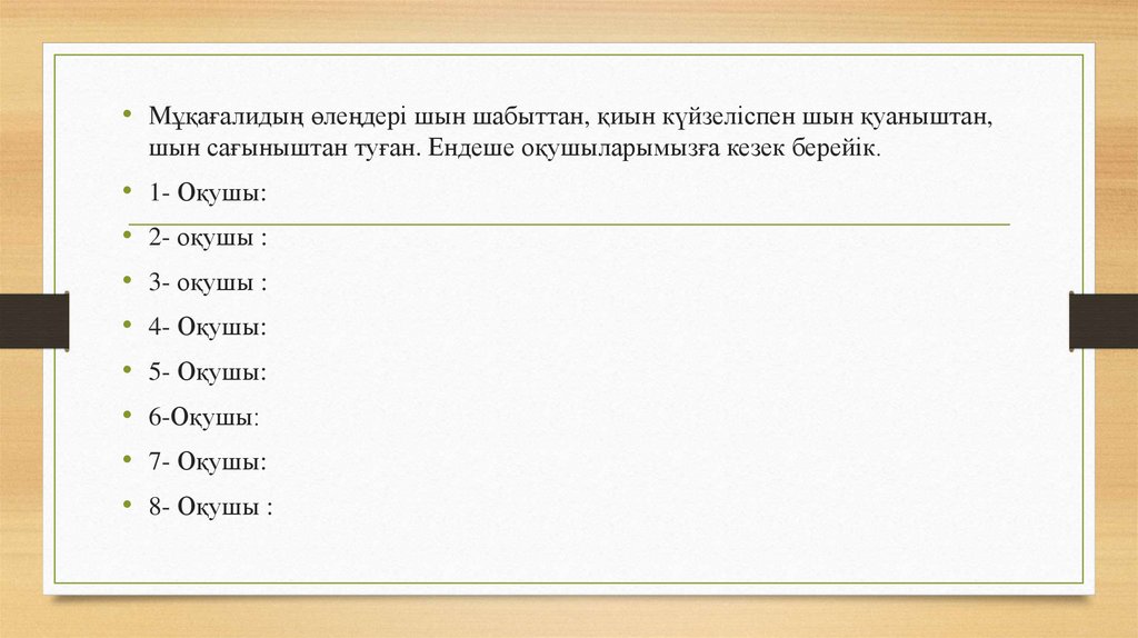 • Мұқағалидың өлеңдері шын шабыттан, қиын күйзеліспен шын қуаныштан,шын сағыныштан туған. Ендеше оқушыларымызға кезек берейік.