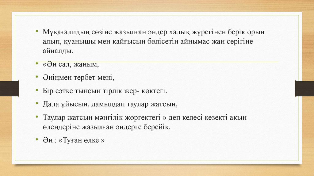 • Мұқағалидың сөзіне жазылған әндер халық жүрегінен берік орыналып, қуанышы мен қайғысын бөлісетін айнымас жан серігіне