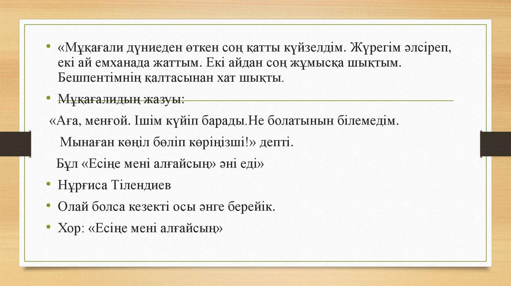 • «Мұқағали дүниеден өткен соң қатты күйзелдім. Жүрегім әлсіреп,екі ай емханада жаттым. Екі айдан соң жұмысқа шықтым.