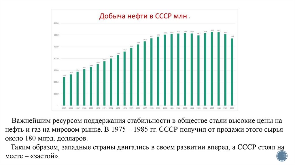 Важнейшим ресурсом поддержания стабильности в обществе стали высокие цены нанефть и газ на мировом рынке. В 1975 – 1985 гг. СССР получил от продажи этого сырья