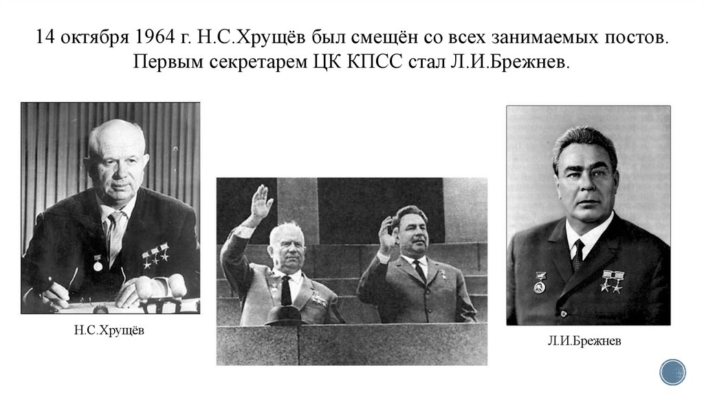 14 октября 1964 г. Н.С.Хрущёв был смещён со всех занимаемых постов.Первым секретарем ЦК КПСС стал Л.И.Брежнев.