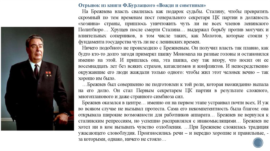 Отрывок из книги Ф.Бурлацкого «Вожди и советники»На Брежнева власть свалилась как подарок судьбы. Сталину, чтобы превратить
