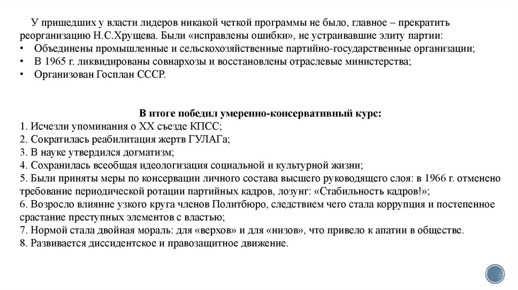 У пришедших у власти лидеров никакой четкой программы не было, главное – прекратитьреорганизацию Н.С.Хрущева. Были «исправлены ошибки», не устраивавшие элиту партии: