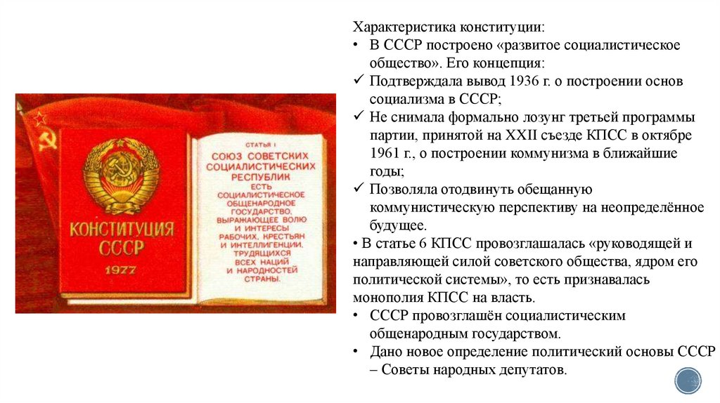 Характеристика конституции:• В СССР построено «развитое социалистическое
