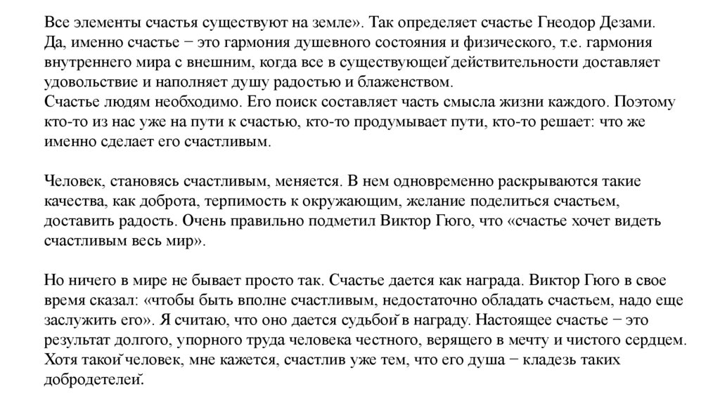 Все элементы счастья существуют на земле». Так определяет счастье Гнеодор Дезами.Да, именно счастье − это гармония душевного состояния и физического, т.е. гармония