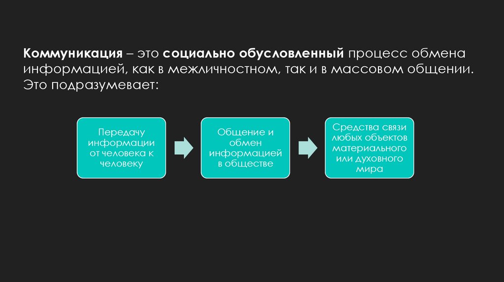 Коммуникация – это социально обусловленный процесс обменаинформацией, как в межличностном, так и в массовом общении.