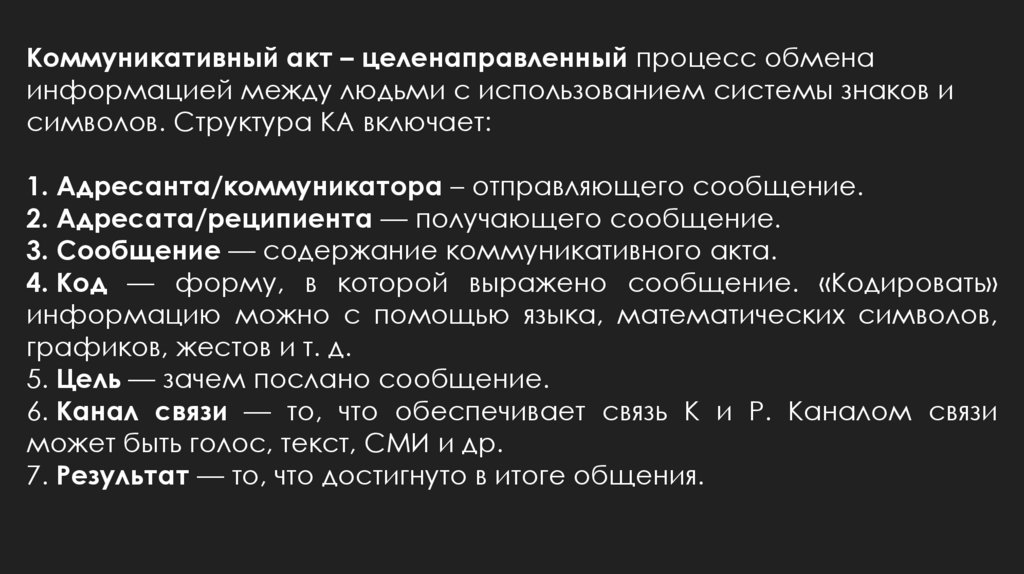 Коммуникативный акт – целенаправленный процесс обменаинформацией между людьми с использованием системы знаков и