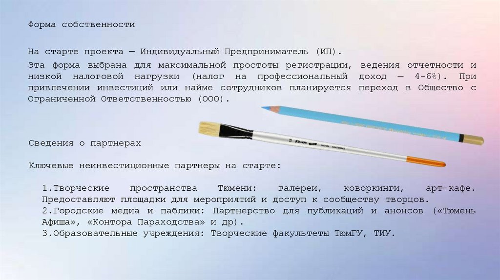 Форма собственностиНа старте проекта — Индивидуальный Предприниматель (ИП).