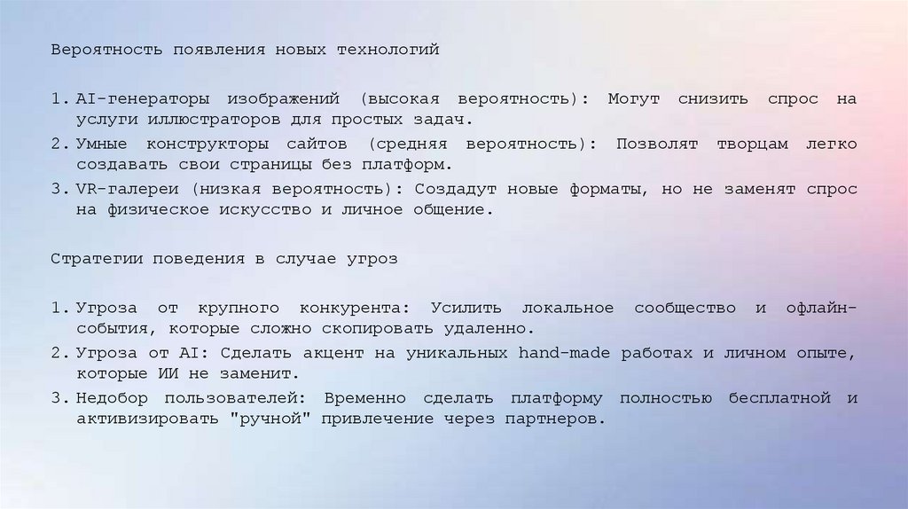 Вероятность появления новых технологий1. AI-генераторы изображений (высокая вероятность): Могут снизить спрос на
