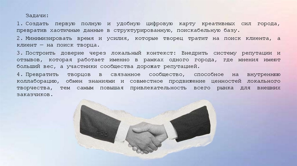 Задачи:1. Создать первую полную и удобную цифровую карту креативных сил города,
