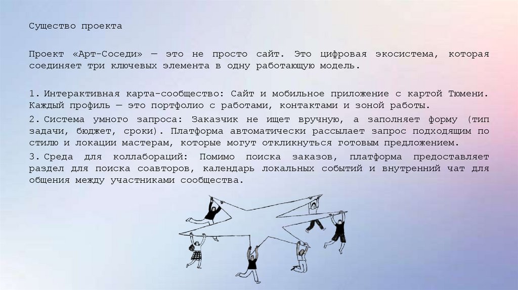 Существо проектаПроект «Арт-Соседи» — это не просто сайт. Это цифровая экосистема, которая