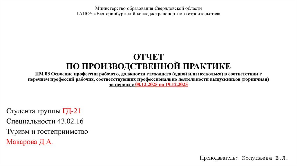 1. Министерство образования Свердловской области ГАПОУ «Екатеринбургский колледж транспортного строительства» ОТЧЕТ ПО