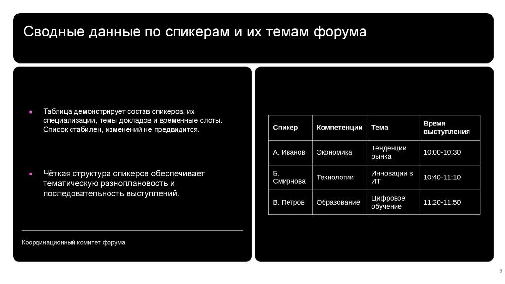 Сводные данные по спикерам и их темам форумаТаблица демонстрирует состав спикеров, их