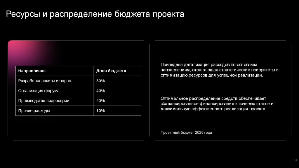 Ресурсы и распределение бюджета проектаПриведена детализация расходов по основным