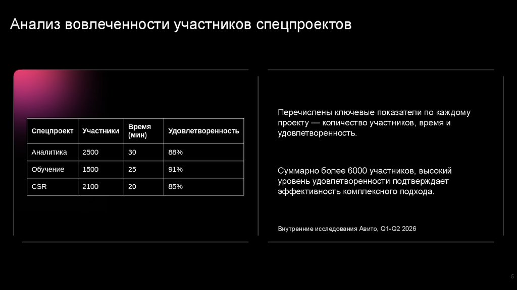 Анализ вовлеченности участников спецпроектовПеречислены ключевые показатели по каждому