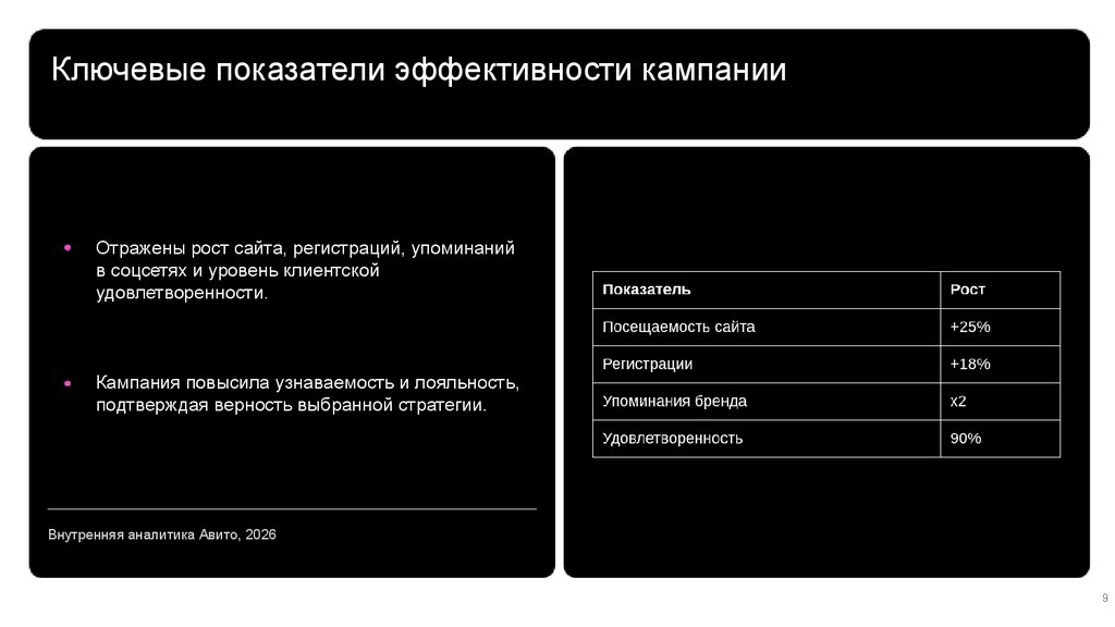 Ключевые показатели эффективности кампанииОтражены рост сайта, регистраций, упоминаний