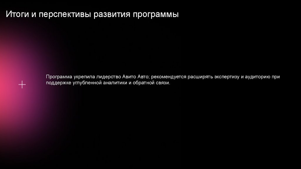 Итоги и перспективы развития программыПрограмма укрепила лидерство Авито Авто; рекомендуется расширять экспертизу и аудиторию при