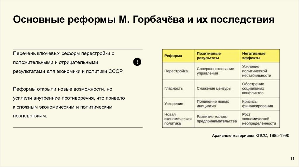 Основные реформы М. Горбачёва и их последствияПеречень ключевых реформ перестройки с