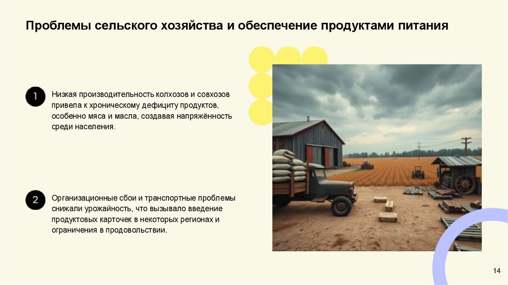 Проблемы сельского хозяйства и обеспечение продуктами питанияНизкая производительность колхозов и совхозов