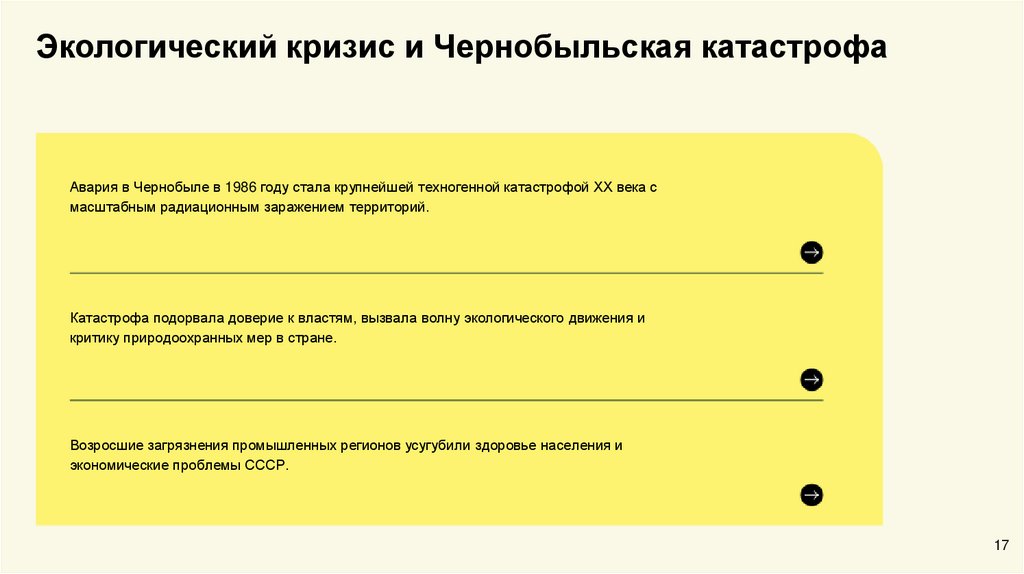 Экологический кризис и Чернобыльская катастрофаАвария в Чернобыле в 1986 году стала крупнейшей техногенной катастрофой XX века с