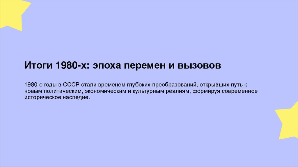 Итоги 1980-х: эпоха перемен и вызовов1980-е годы в СССР стали временем глубоких преобразований, открывших путь к