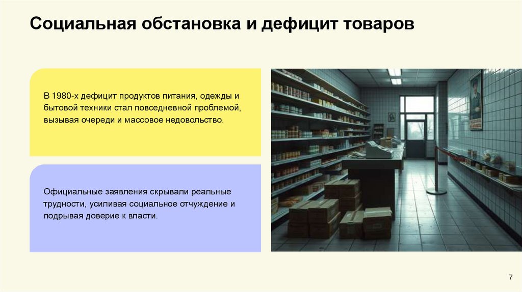 Социальная обстановка и дефицит товаровВ 1980-х дефицит продуктов питания, одежды и