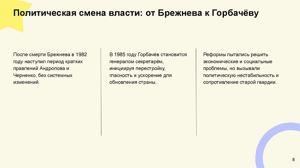 Политическая смена власти: от Брежнева к ГорбачёвуПосле смерти Брежнева в 1982