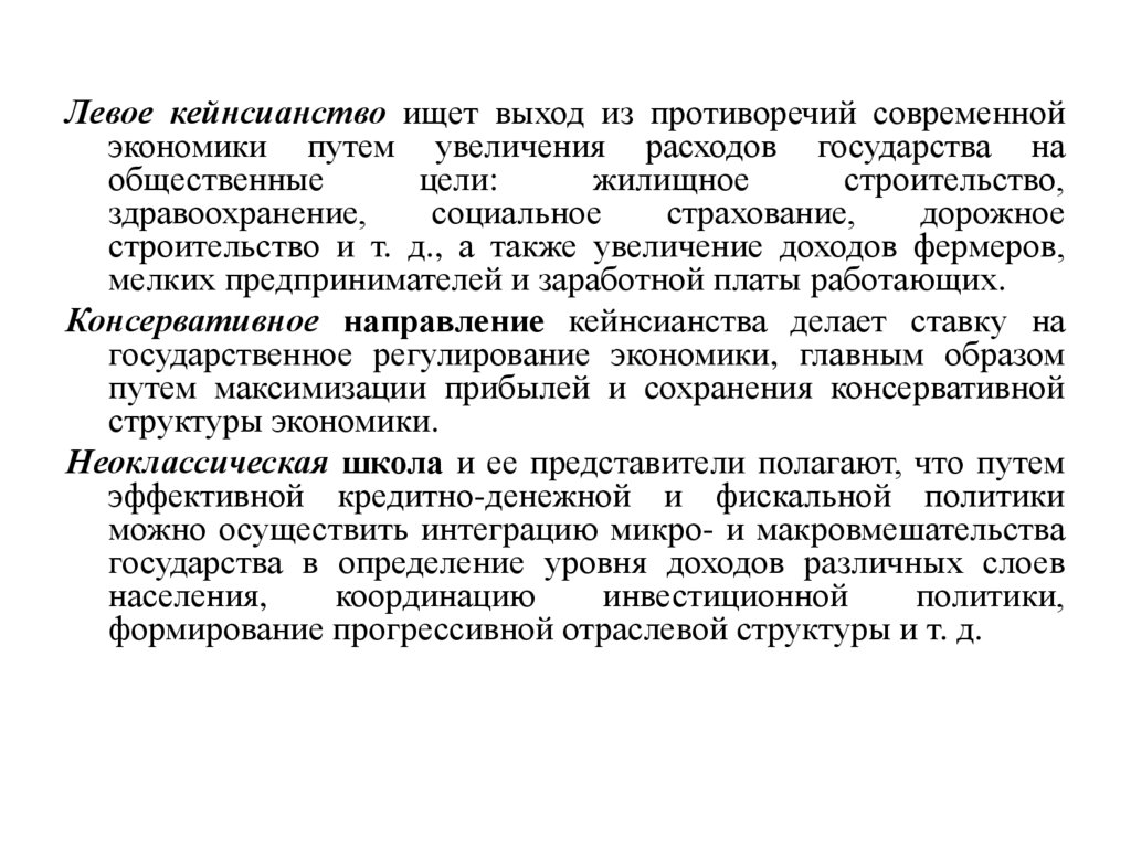 Левое кейнсианство ищет выход из противоречий современнойэкономики путем увеличения расходов государства на