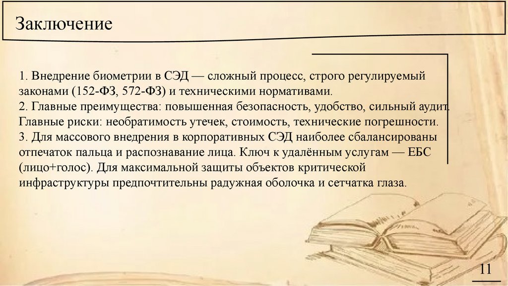 Заключение1. Внедрение биометрии в СЭД — сложный процесс, строго регулируемый
