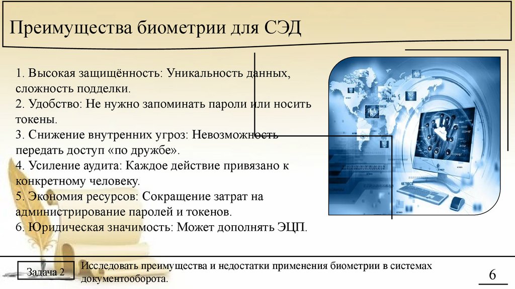 Преимущества биометрии для СЭД1. Высокая защищённость: Уникальность данных,