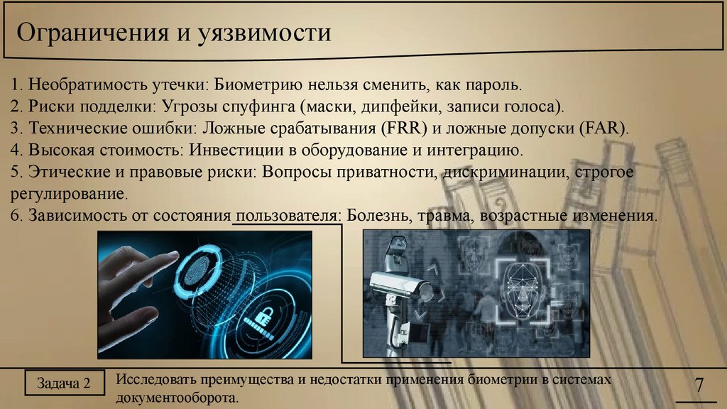 Ограничения и уязвимости1. Необратимость утечки: Биометрию нельзя сменить, как пароль.