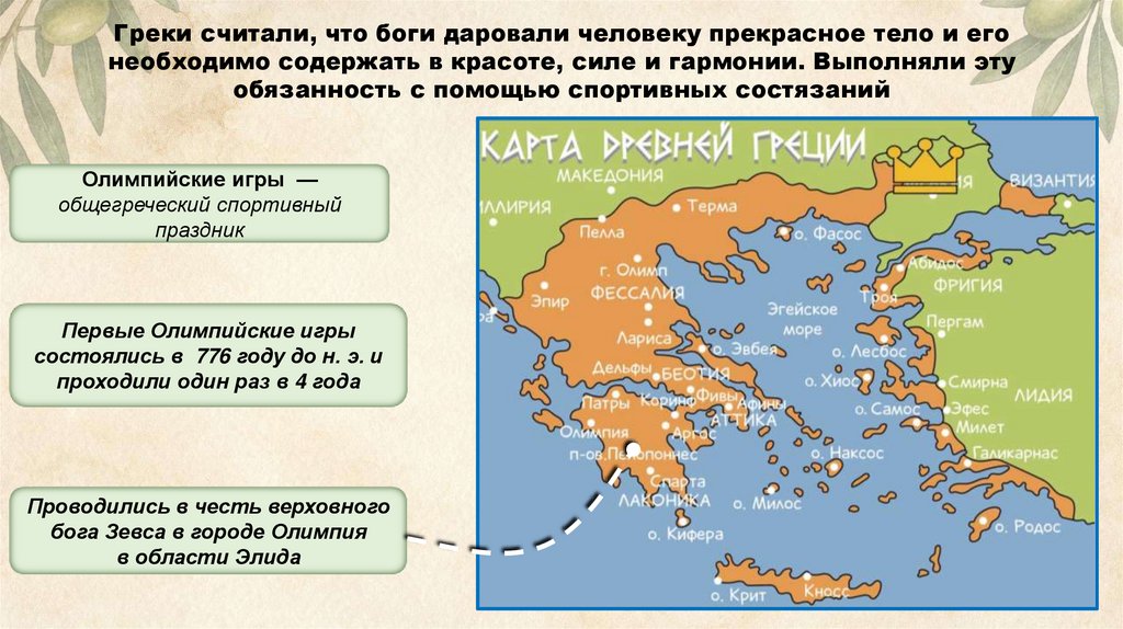 Греки считали, что боги даровали человеку прекрасное тело и егонеобходимо содержать в красоте, силе и гармонии. Выполняли эту