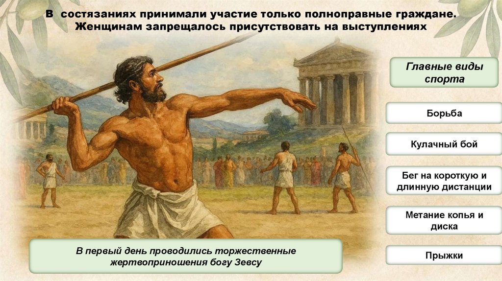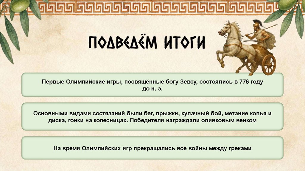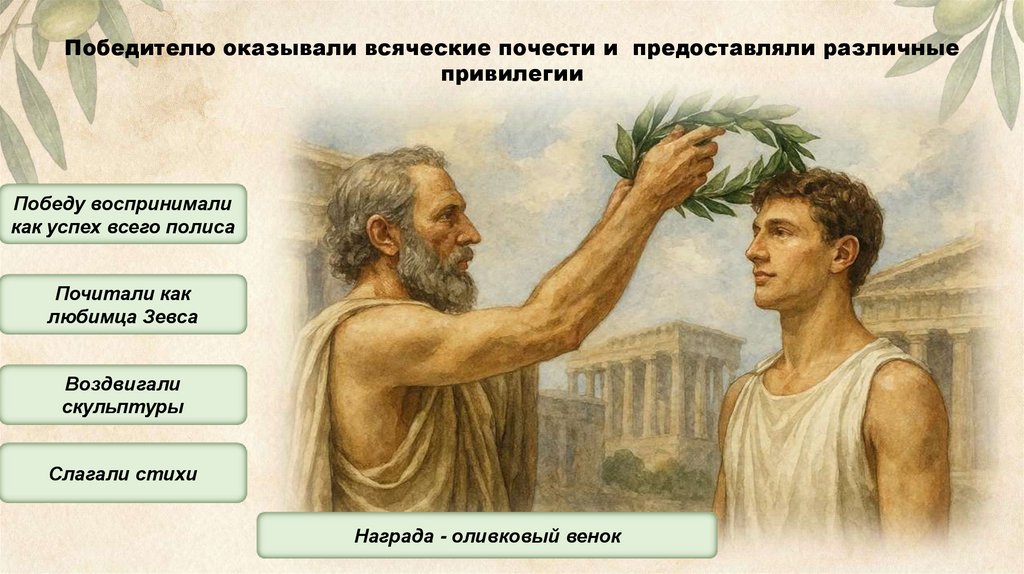 диска, гонки на колесницах. Победителя награждали оливковым венком