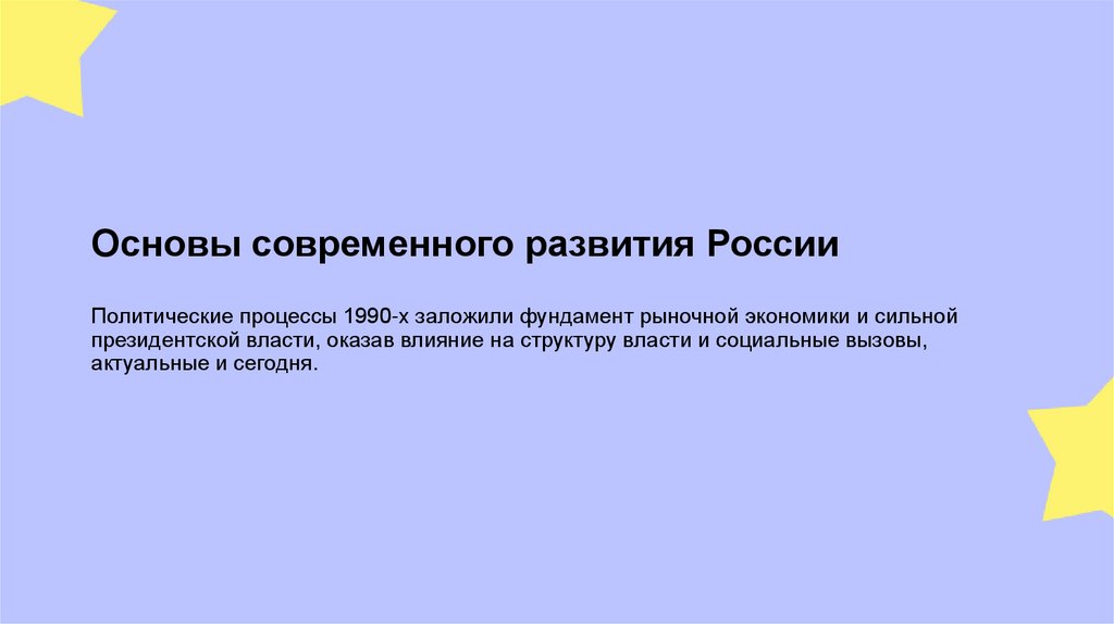 Основы современного развития РоссииПолитические процессы 1990-х заложили фундамент рыночной экономики и сильной