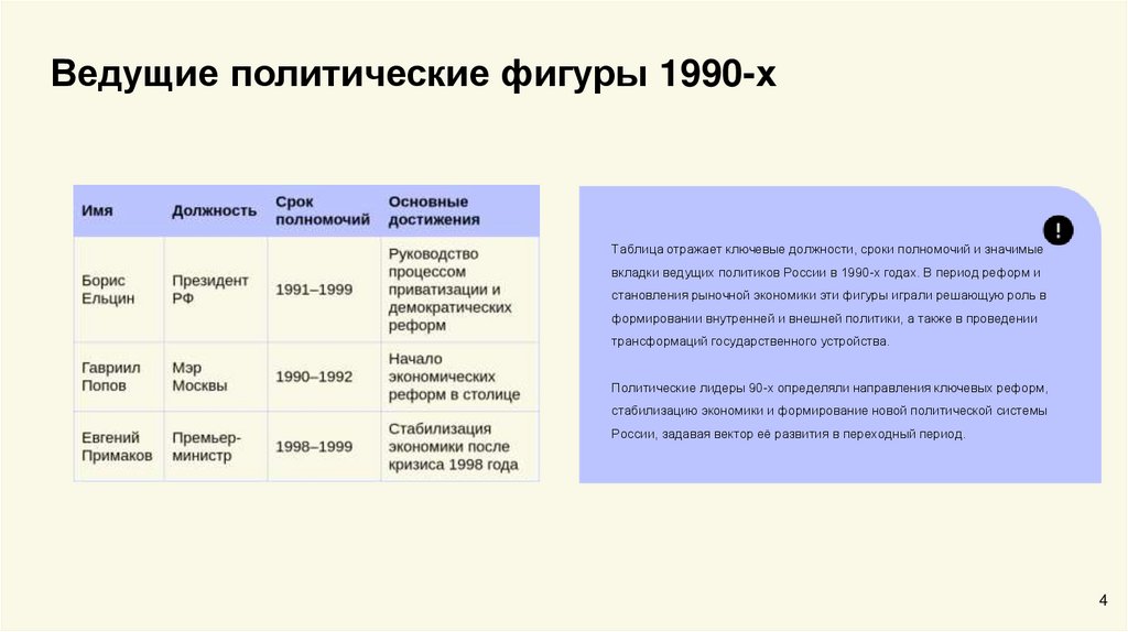 Ведущие политические фигуры 1990-хТаблица отражает ключевые должности, сроки полномочий и значимые