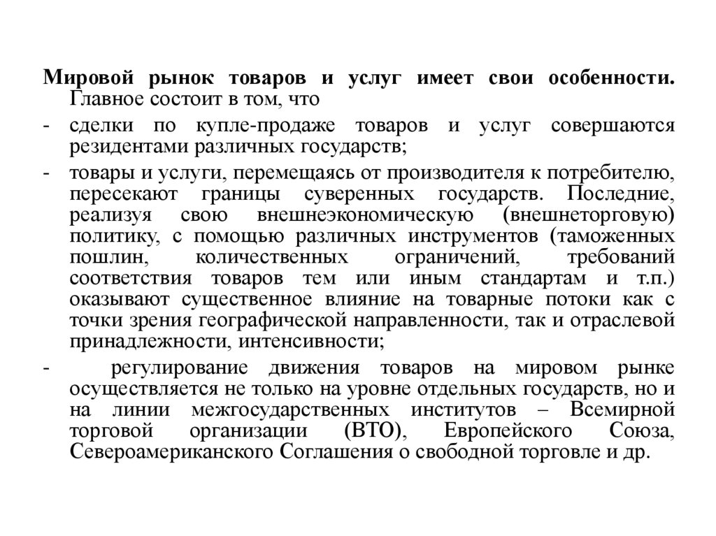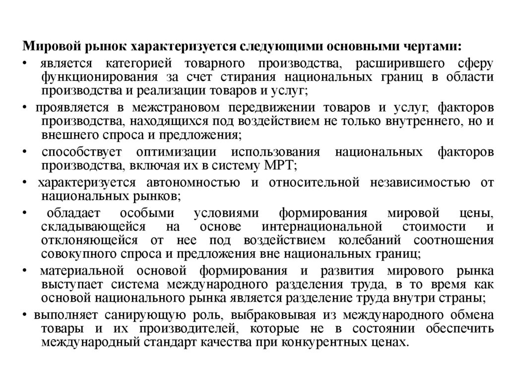 Мировой рынок характеризуется следующими основными чертами:• является категорией товарного производства, расширившего сферу