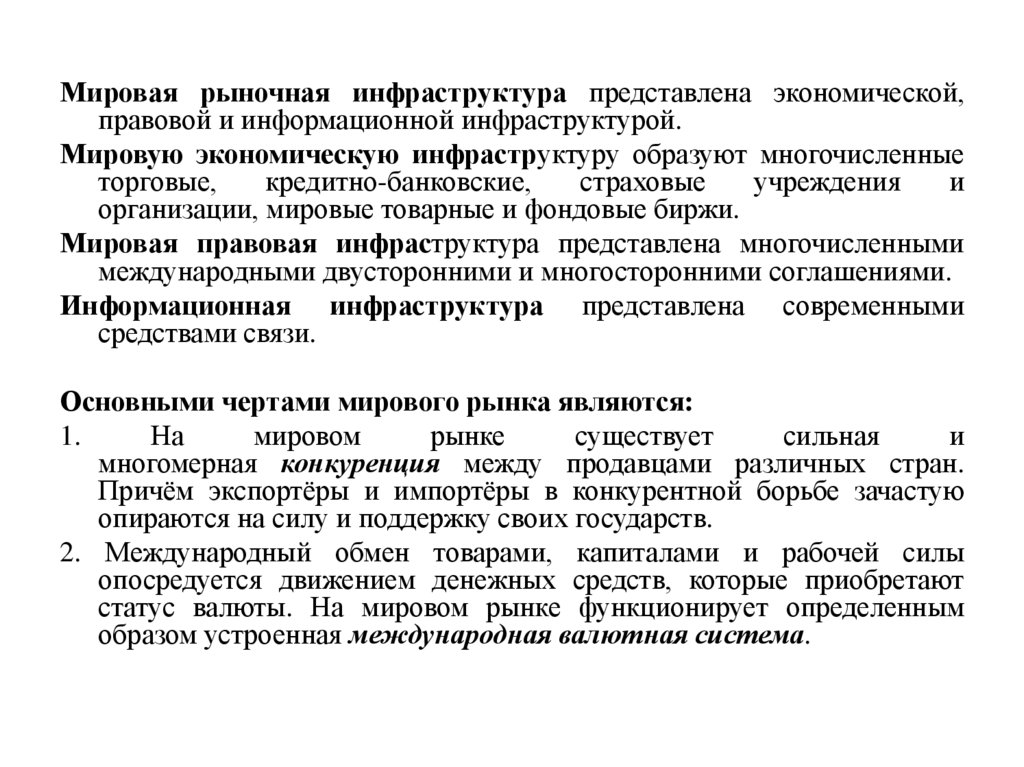 Мировая рыночная инфраструктура представлена экономической,правовой и информационной инфраструктурой.