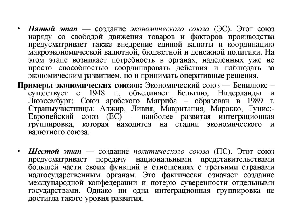 • Пятый этап — создание экономического союза (ЭС). Этот союзнаряду со свободой движения товаров и факторов производства